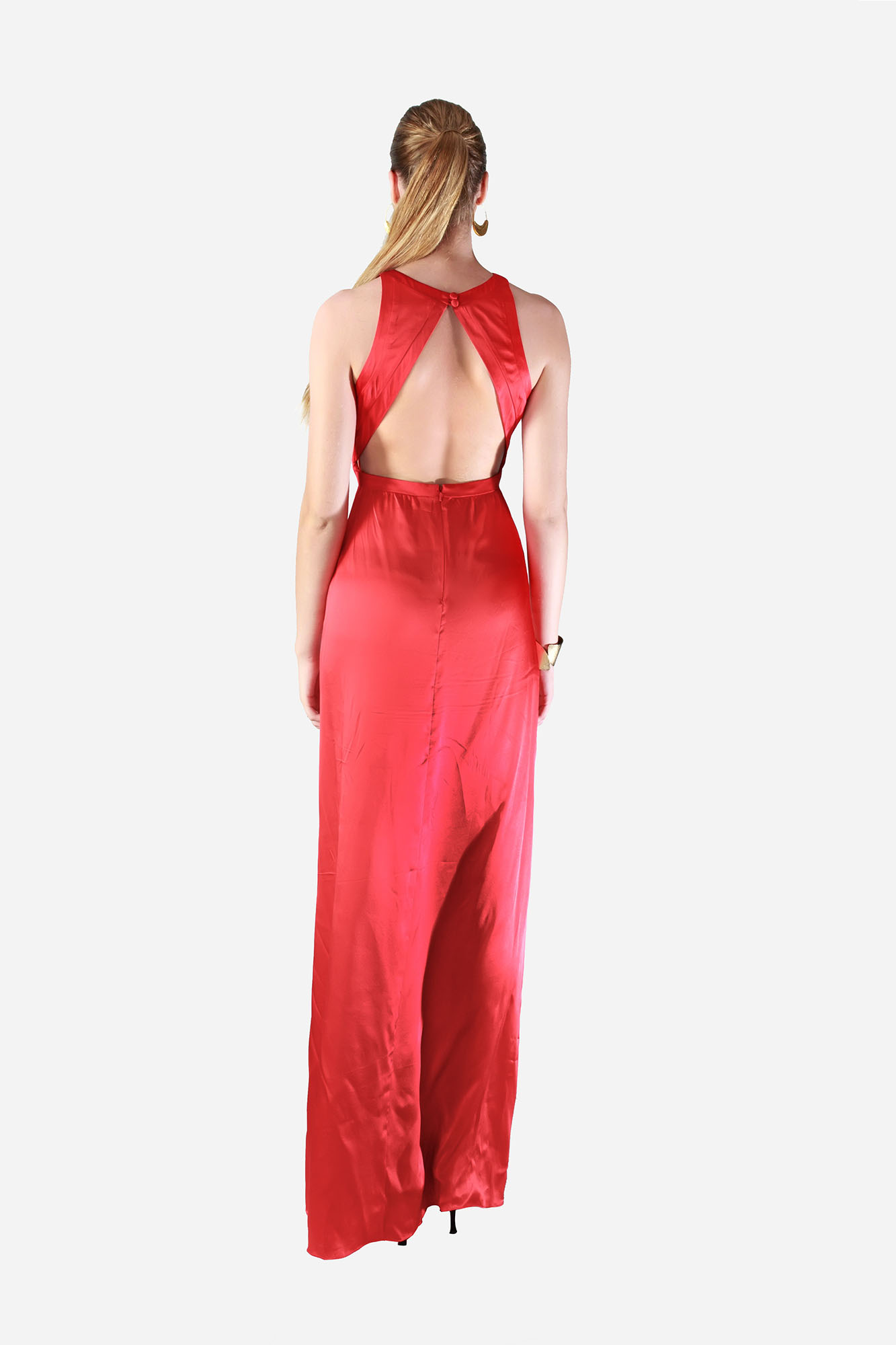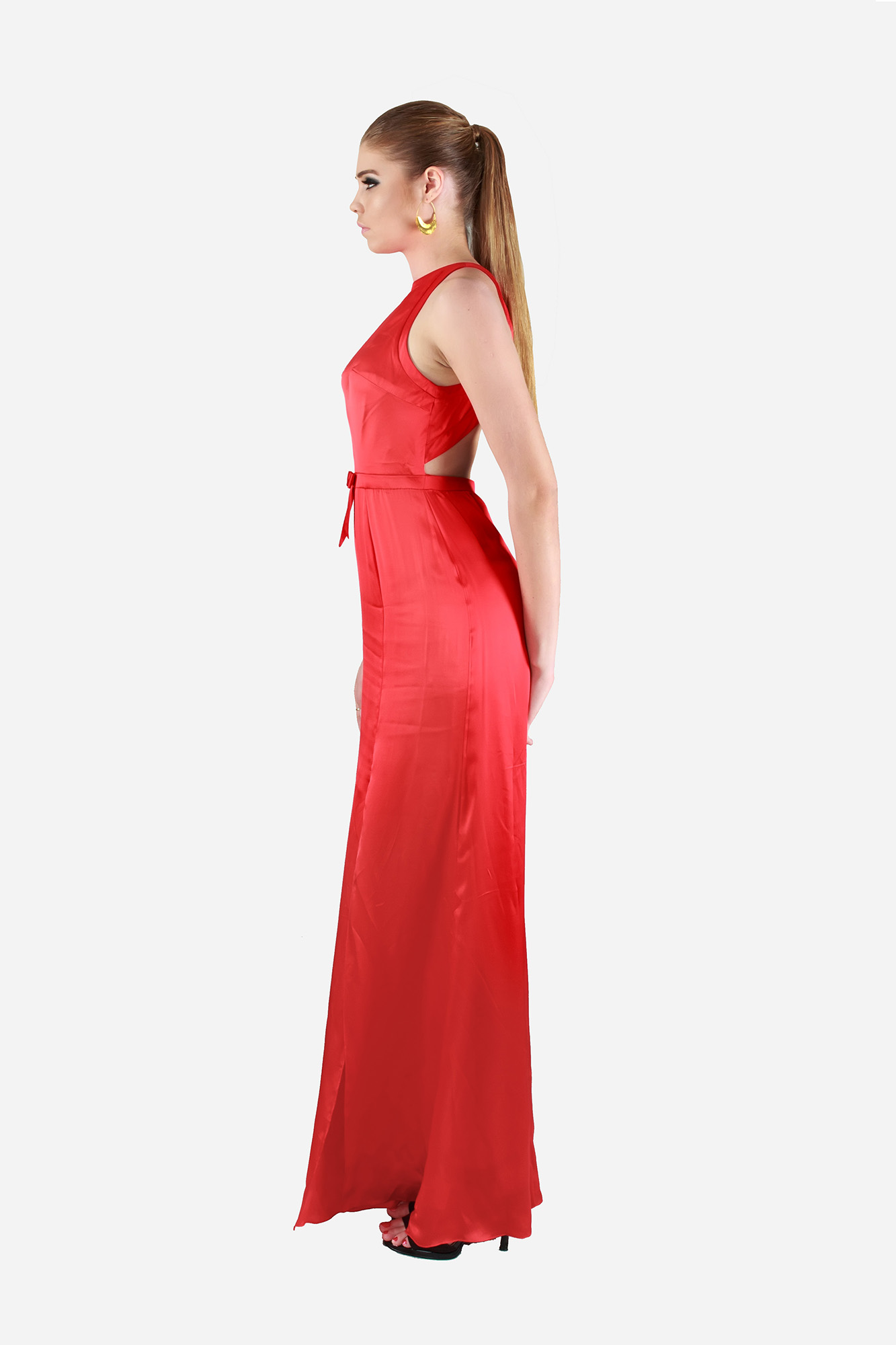 Make a lasting impression with this SCARLET DESIRE DRESS. This open back dress is made in 100% pure satin silk in deep scarlet.