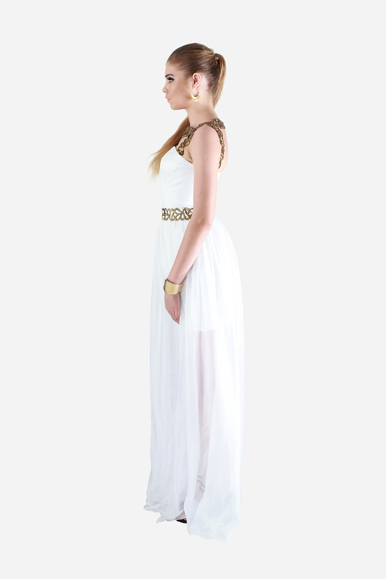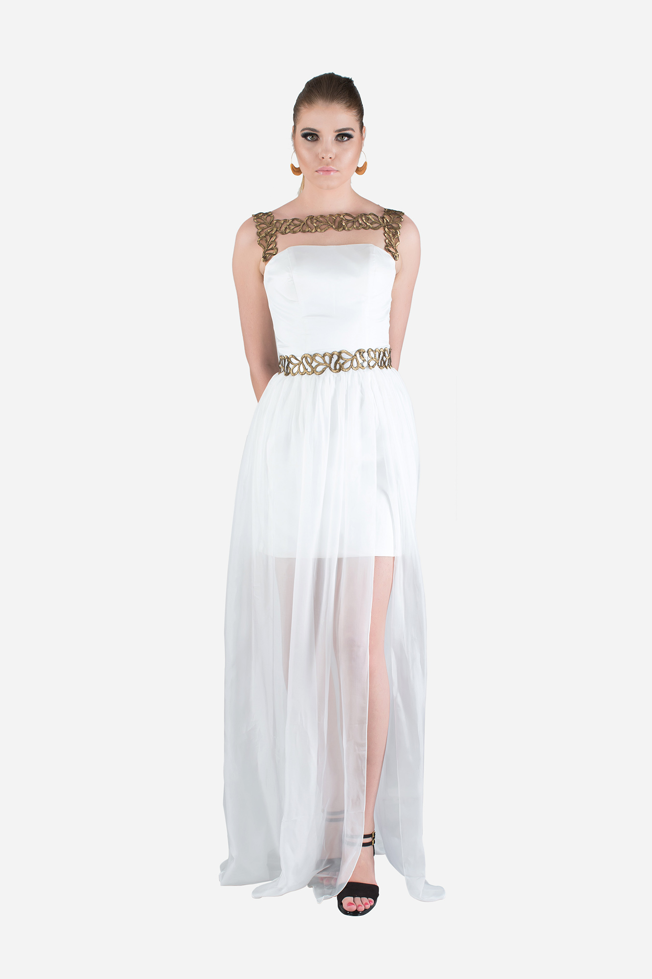 From the fresh white hue to the antique gold trims, this CLEOPATRA dress is a summer must have.