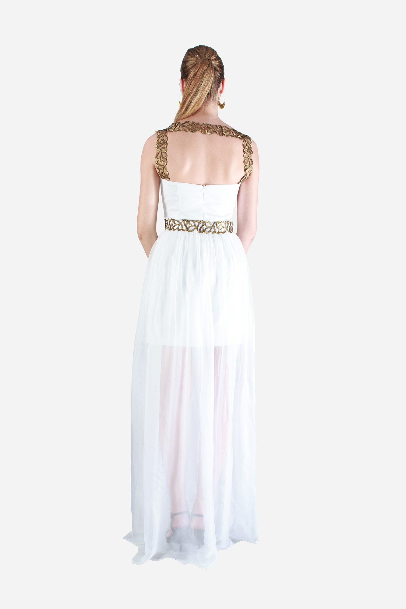 This gorgeous dress is made with 100% pure white chiffon silk. The trim on the shoulder, neckline and belt is made with antique gold trim sourced from the east. The sheer skirt adds drama to this dress, but it is detachable and it can also be worn as a short dress. It has a built in-bustier and satin lining.